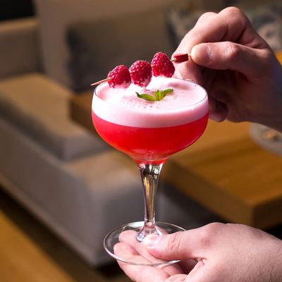 Mix all ingredients in a shaker and shake until chilled. Strain and pour in a Martini glass. Garnish with 3 raspberries.